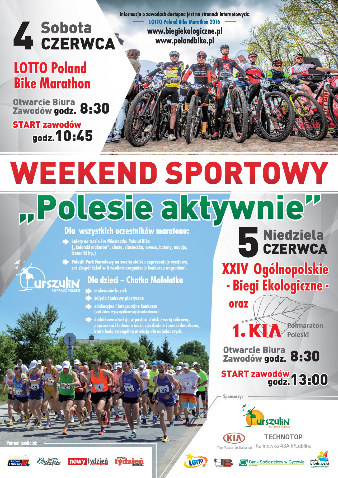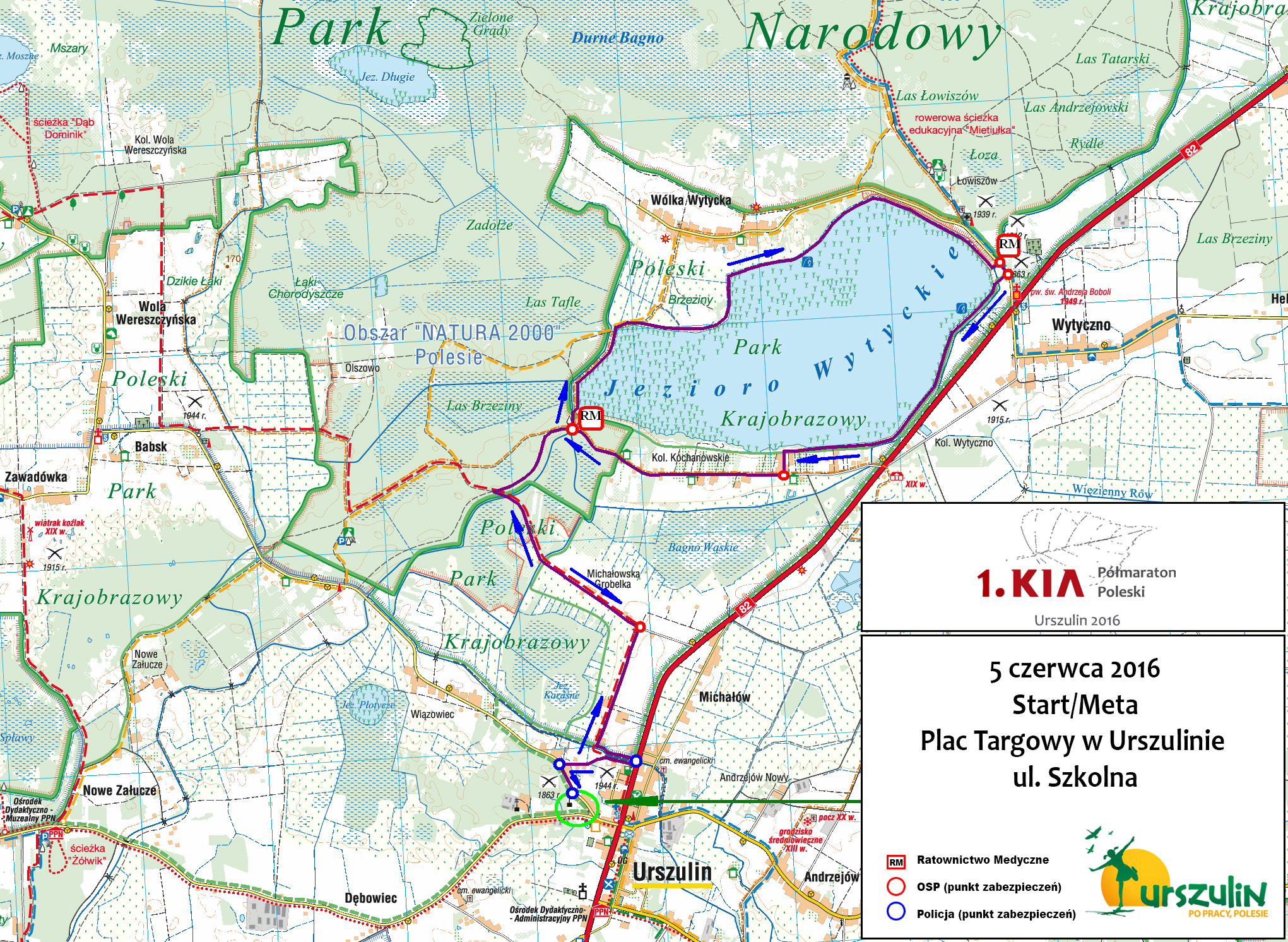 Informujemy uczestników XXIV Ogólnopolskich Biegów Ekologicznych dystans na 5 i 10 km – bieg będzie odbywał się po drodze asfaltowej i posiada atest PZLA. Natomiast 1. KIA Półmaraton Poleski (21 km) zaplanowany jest po zróżnicowanym terenie tj. asfalt, szutr, droga pisakowa oraz wąskie ścieżki trawiaste i nie posiada atestu PZLA.