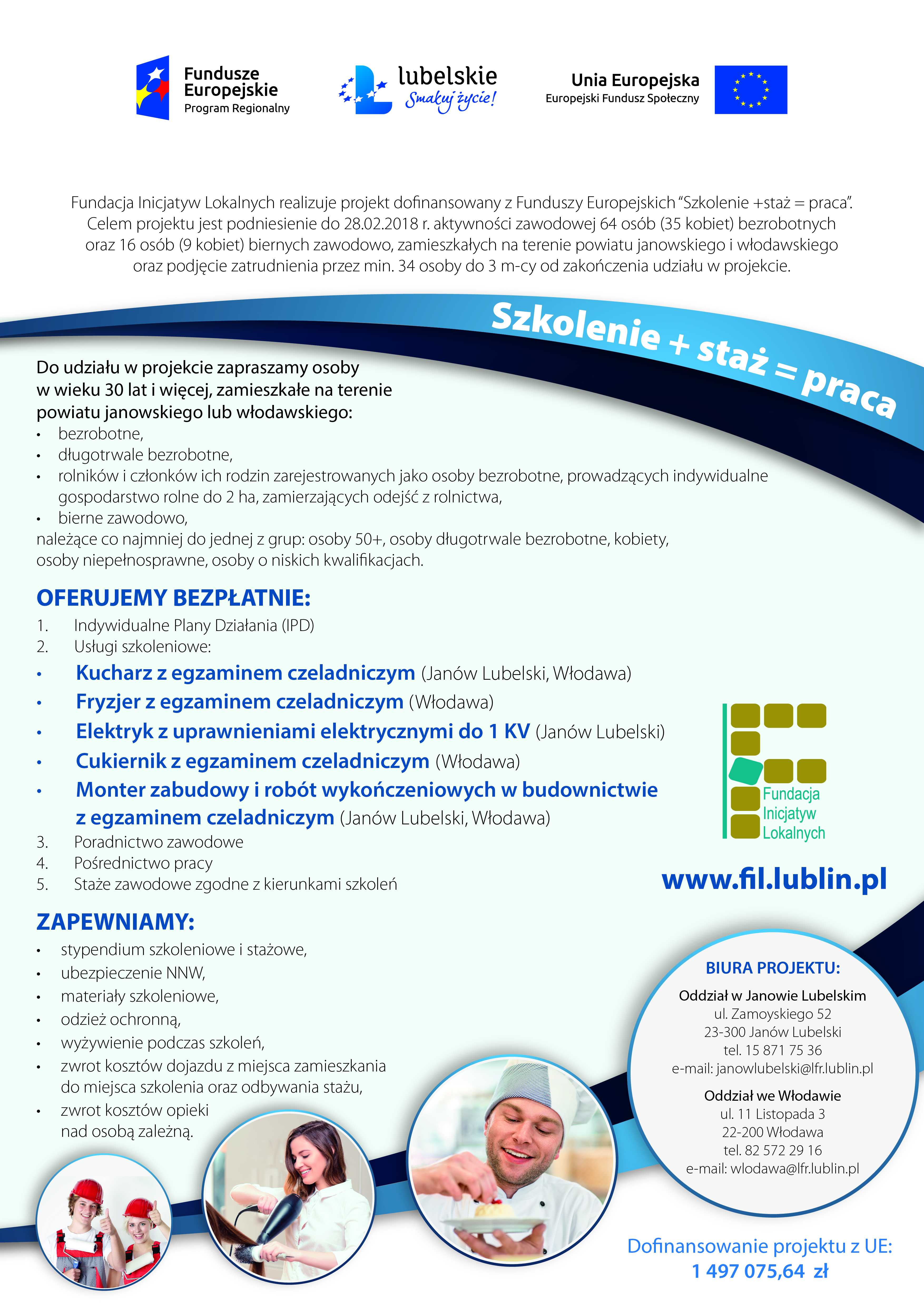 Projekt realizowany jest w ramach Regionalnego Programu Operacyjnego Województwa Lubelskiego na lata 2014-2020, Oś Priorytetowa 9 Rynek pracy, Działanie 9.1. Aktywizacja zawodowa, współfinansowanego ze środków Unii Europejskiej w ramach Europejskiego Funduszu Społecznego.