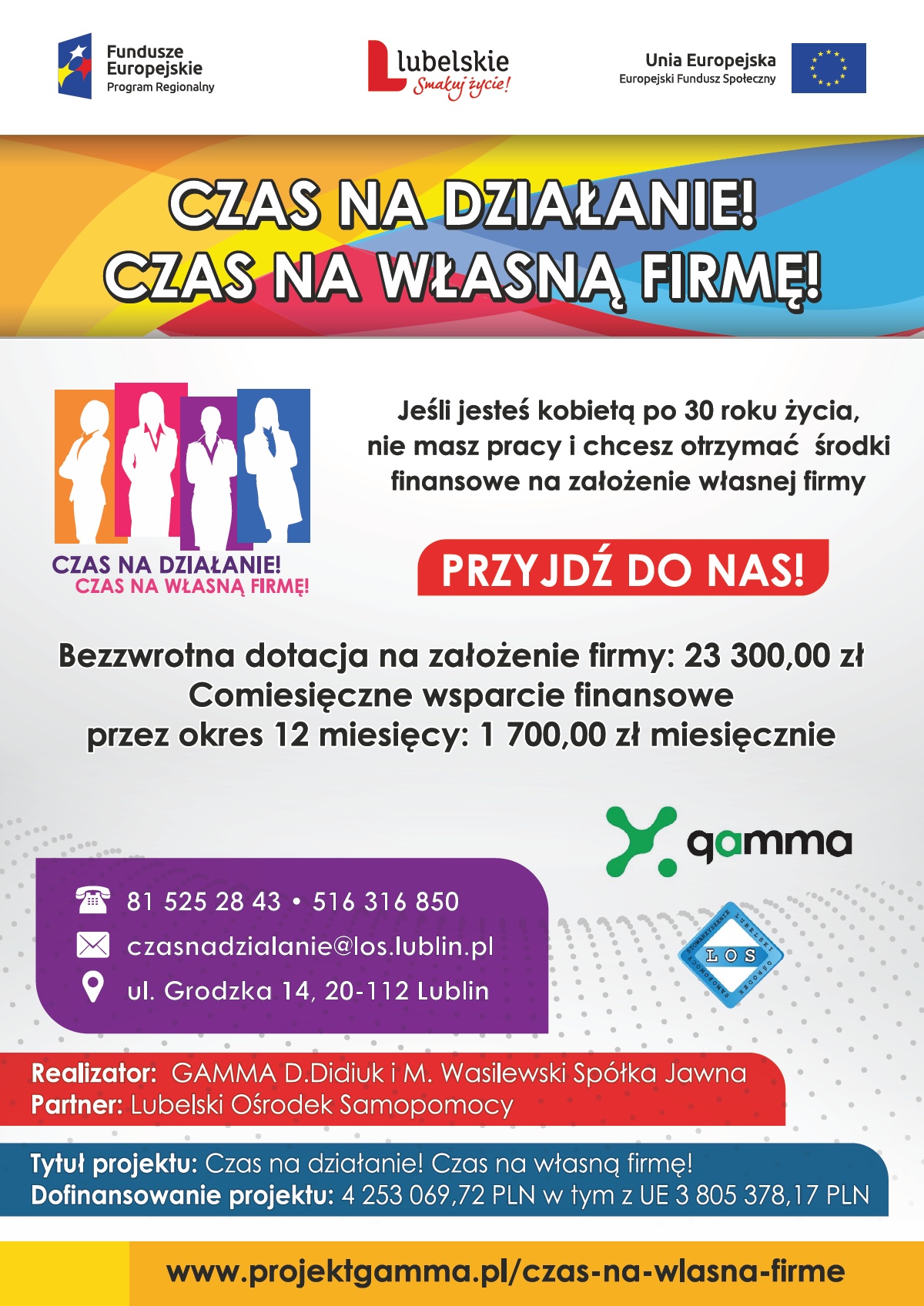 Stowarzyszenie Lubelski Ośrodek Samopomocy w ramach projektu „Czas na działanie! Czas na własną firmę!” realizowanego wspólnie z Gamma Projekt umożliwia nieaktywnym zawodowo kobietom po 30 roku życia z województwa lubelskiego pozyskanie wsparcia finansowego na uruchomienie własnej firmy. W ramach projektu każda z 75 zakwalifikowanych uczestniczek otrzyma jednorazową dotację w wysokości do 23 300 zł oraz w okresie pierwszych 12 miesięcy funkcjonowania utworzonej firmy otrzyma wsparcie pomostowe w wysokości do 1850 zł miesięcznie (średnio 1700 zł). Uczestniczki w ramach projektu otrzymają wsparcie szkoleniowe i doradcze – zostaną kompleksowo przygotowane do podjęcia działalności gospodarczej oraz skorzystają z doradztwa indywidualnego. Nabór do projektu trwa do dnia 5 maja 2017 włącznie lub do wyczerpania miejsc. Szczegółowe informacje oraz dokumenty zgłoszeniowe dostępne są na stronie internetowej: www.projektgamma.pl/czas-na-dzialanie. Dokumenty aplikacyjne należy składać w siedzibie Stowarzyszenia: Lubelski Ośrodek Samopomocy, Grodzka 14, 20-112 Lublin lub listownie. Dodatkowych informacji udzielamy pod numerem telefonu 81 52 52 843 lub pod adresem poczty elektronicznej: czasnadzialanie@los.lublin.pl. Wsparcie udzielane będzie w ramach Regionalnego Programu Operacyjnego Województwa Lubelskiego na lata 2014-2020, Osi Priorytetowej 9 Rynek pracy, Działanie 9.3 Rozwój przedsiębiorczości.