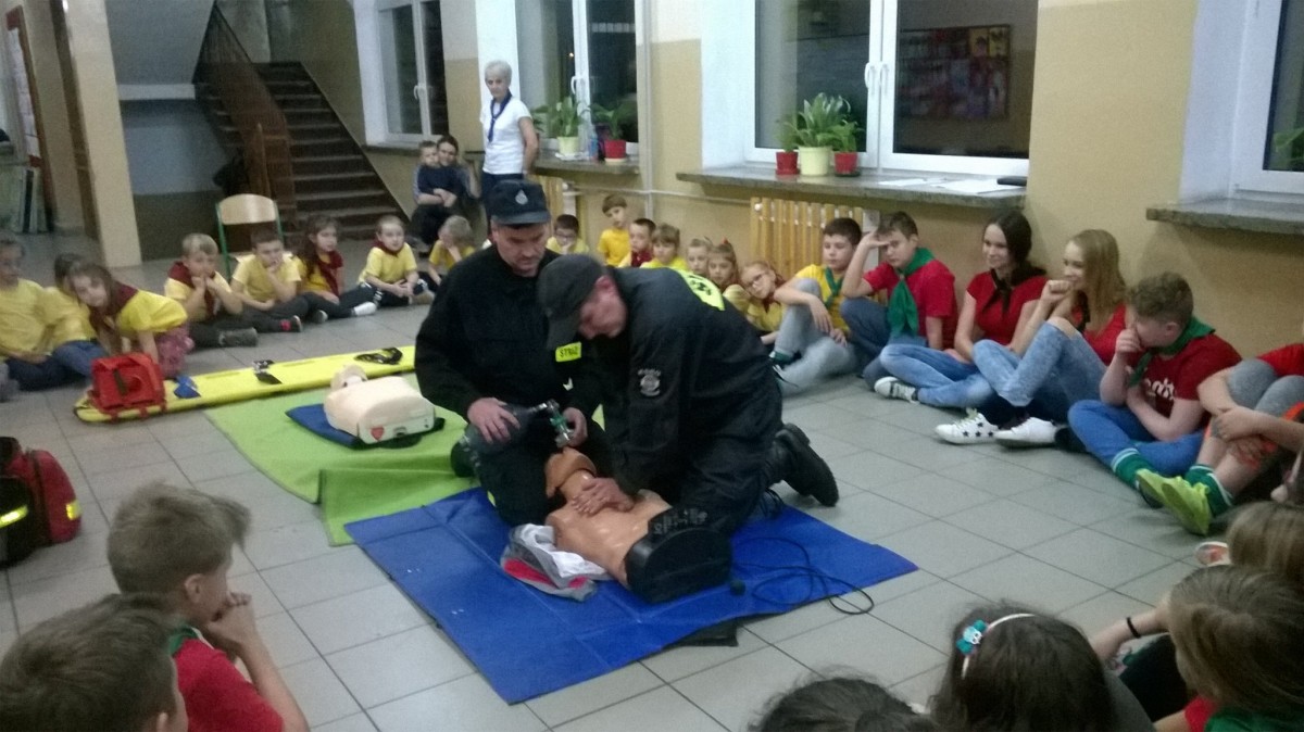 W piątkowy wieczór 27 października br. strażacy z Ochotniczej Straży Pożarnej w Urszulinie zorganizowali dla przyszkolnej drużyny harcerskiej „Poleskie Żółwiki” pokaz udzielania pierwszej pomocy połączony z ćwiczeniami praktycznymi. Pokaz rozpoczął się od przypomnienia zasad postępowania w sytuacji zagrożenia życia: zasłabnięcie, utrata przytomności, złe samopoczucie itp. Harcerze wykazali się doskonałą wiedzą, jak należy zawiadomić Pogotowie Ratunkowe, znają numery alarmowe, na które należy dzwonić, aby uzyskać pomoc dla osoby poszkodowanej. Następnie strażacy zaprezentowali sposoby udzielania pierwszej pomocy poszkodowanemu, zarówno osobie dorosłej, jak też małemu dziecku. Młodzi skauci sprawdzili swoje umiejętności na manekinie: próbowali nawiązać kontakt z poszkodowanym, sprawdzali oddech, reanimowali poprzez ucisk klatki piersiowej. Na koniec strażacy omówili podstawowe zasady bezpiecznego zachowania się dzieci podczas zabaw i korzystania z zimowego wypoczynku szczególnie na zbiornikach wodnych, które już niedługo pokryją się lodem. W podziękowaniu za spotkanie harcerze obdarowali szkolących pamiątkowym dyplomem i pięknym uśmiechem.