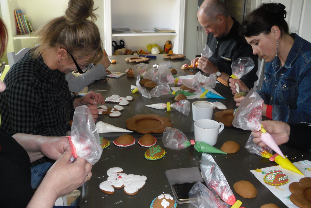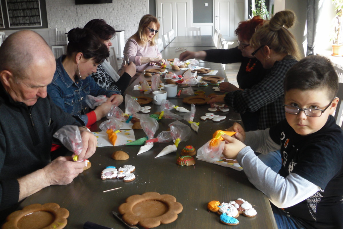 Wkraczając w okres przygotowań do Świąt, Książnica Pana Jana w Wytycznie w dniu 6 kwietnia br., pod kierownictwem pani Anna Rymkiewicz z „Kresowych Pierników” zorganizowała warsztaty, których celem było stworzenie oryginalnych stroików wielkanocnych z piernikowego ciasta. Stroik zawierał piernikowy talerzyk, na którym stał zając oraz pisanki w formacie 3D, malowane lukrem w wiosennych kolorach. Ozdabianie wymagało od uczestników warsztatów wielkiej precyzji i pomysłowości, co wcale nie było takie łatwe. Udział w warsztatach brały nie tylko panie, ale również i panowie, którzy świetnie sobie radzili z lukrowaniem całego stroika.