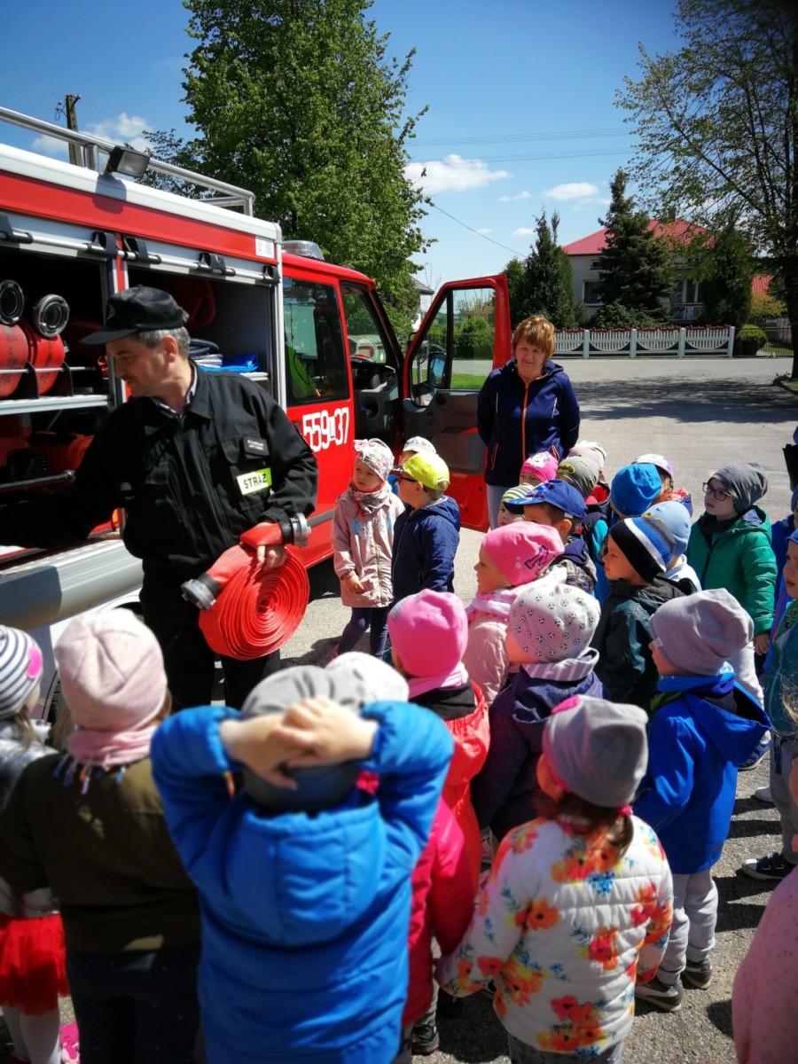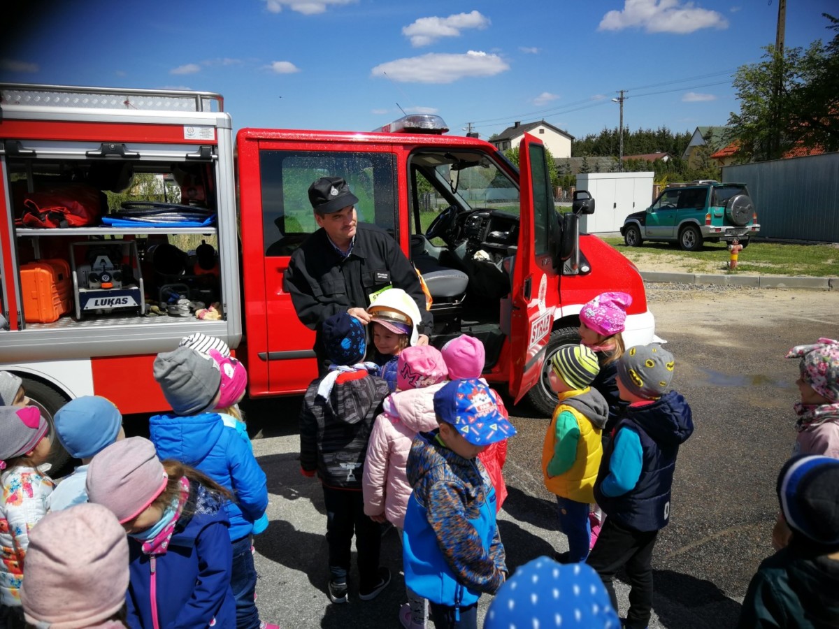 Szczególnie cieszy nas fakt, że dzieci i nauczyciele z własnej inicjatywy uczestniczą w wielu spotkaniach i pokazach strażackich umożliwiających naszym najmłodszym poznanie specyfiki pracy strażaka. Na tegorocznych pokazach każdy mógł z bliska zobaczyć a nawet dotknąć urządzeń, z których strażacy korzystają podczas akcji ratowniczo – gaśniczych. Można było założyć hełm oraz sprawdzić jak działają strażackie węże. Dzieci miały również okazję zobaczyć sprzęt do ratownictwa technicznego i do udzielania pierwszej pomocy. Strażacy opowiadali o swojej pracy oraz prezentowali możliwości samochodu i sprzętu ratowniczego znajdującego się na jego wyposażeniu oraz pytali o numery alarmowe i sytuacje w jakich należy je tylko używać. Dzieci dowiedziały się także, że oprócz gaszenia pożarów strażacy pomagają ludziom w najtrudniejszych sytuacjach takich jak wypadki komunikacyjne, huragany, powodzie i podtopienia i w wielu innych. Na zakończenie spotkania maluchy podziękowały za miłe przyjęcie i przekazane wiadomości wręczając druhom pamiątkowy dyplom. Wizyta u strażaków była dla wszystkich wielkim przeżyciem.