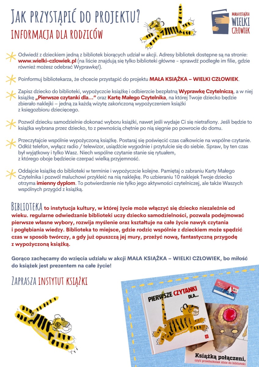 Zapraszamy wszystkie dzieci w wieku przedszkolnym (rocznik 2014 – 2017) z rodzicami do Gminnej Biblioteki Publicznej w Urszulinie po odbiór wyprawki małego czytelnika w ramach projektu „Mała Książka – Wielki Człowiek”. Czekają Wyprawki Czytelnicze, Karty Małego Czytelnika, poradniki dla rodziców, oraz drobne upominki. Akcja polega na zbieraniu naklejek, które dzieci dostają za każdorazowe wypożyczenie książki z zasobów biblioteki. Każdy kto zbierze 10 naklejek dostanie dyplom. Zaproszenie przedszkolaków oraz rodziców do bibliotek ma na celu poprawę stanu czytelnictwa i wyrabiania nawyku czytania już od najmłodszych lat. Czytanie książek wpływa na rozwój dziecka, wzbogaca słownictwo, rozwija wyobraźnię, przenosi w świat baśni, legend, bajek, historii. Zachęcanie do czytania, zaszczepienie miłości do książek w jak najmłodszym wieku, bez wątpienia będzie miało pozytywny wpływ na rozwój dziecka oraz sukcesy odnoszone w nauce. Kampania ma zakres ogólnopolski, w której bierze udział prawie 6 tysięcy bibliotek w całym kraju. Od 2018 roku z projektu skorzystało już blisko 300 tysięcy przedszkolaków. Projekt jest finansowany ze środków Ministerstwa Kultury i Dziedzictwa Narodowego. Akcja może przynieść zadowalające efekty wyłącznie dzięki zaangażowaniu rodziców, którzy zabiorą swoje pociechy do biblioteki i zachęca do korzystania z dostępnych tam książek. Niech czytanie i obcowanie z książkami będzie ważnym elementem życia zarówno naszych dzieci jak i nas samych. Zadbajmy by biblioteka była stałym miejscem na mapie odwiedzin tak jak np. sklep czy bank .
